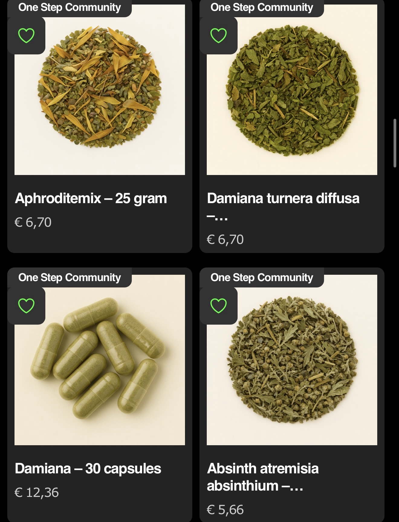 Het kruidenassortiment van One Step Community bestaat uit hoogwaardige botanicals die zorgvuldig worden geselecteerd, gedroogd en verpakt. Binnen deze lijn behoren Aphroditemix, Damiana (kruid en capsules) en Absinth (Artemisia absinthium) tot de meest gekozen producten. Elk kruid heeft een unieke traditionele achtergrond, natuurlijke geur en herkenbare structuur, en wordt volledig vrij van synthetische toevoegingen geleverd.